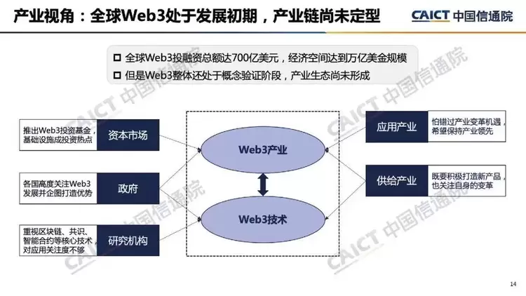 6. 在产业视角,Web3创新性的形成了以数字资产为媒介的经济空间,但全球Web3产业尚未形成稳定的规模和成熟的模式。多国政府均对Web3发展高度关注并保持积极探索,标准化组织正在围绕分布式标识、数字资产等重点方向开展技术研究与标准制定,Web3投融资规模与数量均保持持续增长,互联网企业与来自其他行业的企业都在通过Web3寻找新的产业机遇。