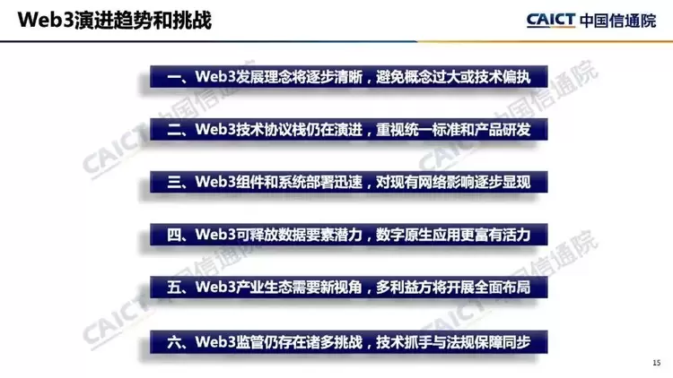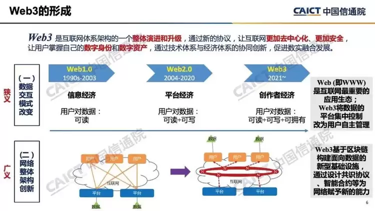 1. Web3不只是互联网应用层的简单创新,可能会带来互联网体系架构整体性演进和系统性升级。Web3是在区块链等技术出现后的下一代互联网框架探索,通过共识协议、加密通信、智能合约、分布式应用等创新设计,重构互联网应用生态,进一步发挥数据要素价值。但Web3仍处于发展初期,技术与产业的定义尚未完全固定,发展路径存在不确定性。