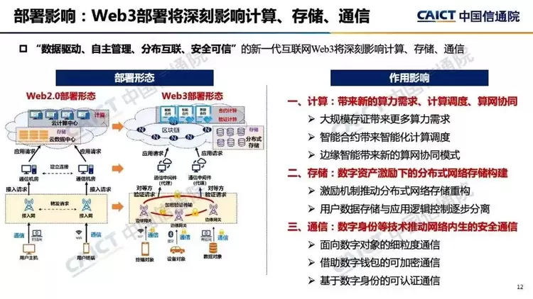 4. 在部署视角,Web3将构建数据驱动、自主管理、分布互联、安全可信的新一代互联网。在计算方面,对网络带来新的算力需求、计算调度、算网协同;在存储方面,逐步构建数字资产激励下的分布式网络存储设施;在通信方面,数字身份等技术将推动网络内生的安全通信。