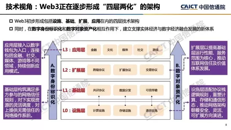 2. 在技术视角,Web3初步形成“四层两化”的基本框架。其中,设施层基本复用了现有承载网络,基础层主要是基于区块链技术构建去中心化的信任网络,扩展层通过“胖协议栈”设计来丰富共性服务,为应用层提供更多能力支持。同时,Web3通过数字对象资产化为数据要素的市场化流通和配置提供技术赋能,通过数字身份标识化为全网统一的数字身份和分布式的细粒度认证提供实现机制。