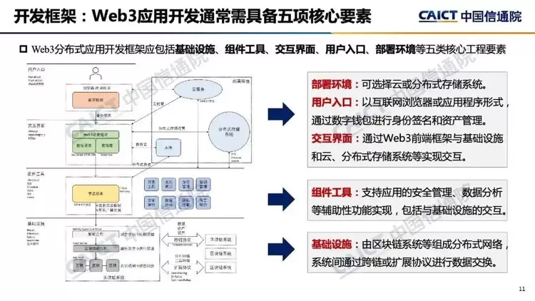 3. 在开发视角,Web3通过五类工程要素组成分布式应用的开发框架。其中,基础设施是由多个区块链系统组成的分布式底层网络;组件工具是上层应用与底层基础设施交互的桥梁;交互界面是Web3应用的呈现方式,通过前端框架实现;用户入口是进入生态的起点,通过数字钱包进行身份签名认证并与应用进行交互;部署环境是代码托管和内容存储环境,用于其他组件部署和运行。