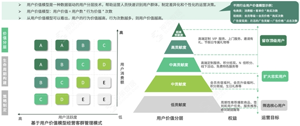 生命周期即用户从认知产品到买单最终变成忠诚顾客或者流失顾客的过程。对于价值分层,每种业务对用户价值的判定不同,例如电商注重 GMV,那么就按照用户对 GMV 的贡献分层;如果是免费工具软件,则按照用户对商业模式的业务贡献值划分,用户活跃度高,增加广告收入划分为高价值,反之就是低价值。