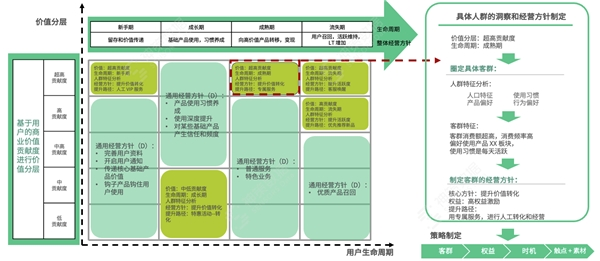 整个坐标轴将每个生命周期的用户价值根据其不同的用户特征都进行了合理且穷尽的划分,用户被严格地按照同一特征聚合,通过调查与数据分析,对其进行偏好特征提取。不同的用户特征决定了企业投入的成本大小及执行的运营策略,例如对超高活跃度用户采取人工客服一对一服务。