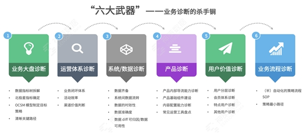 在帮助企业进行全面诊断分析寻找业务破局点时,我们提出了业务诊断的“六大武器”,如下所示: