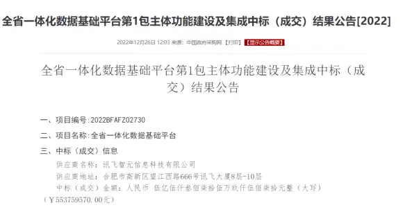 12月26日,安徽省“全省一体化数据基础平台”项目(以下简称“一体化数据平台”)中标结果正式公布,科大讯飞全资子公司讯飞智元以5.5亿中标,将打造“数字安徽”建设的资源中枢和能力底座,全面支撑数字政府、数字经济、数字社会建设,赋能千行百业。