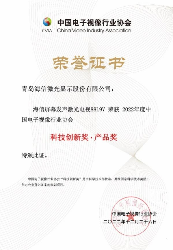12月26日,由中国电子视像行业协会主办的2022(第十八届)中国音视频产业大会(AVF)暨“科技创新奖”颁奖礼在北京首钢香格里拉酒店举行。音视频领域引领行业发展、树立行业标杆的产品、技术、应用等受到隆重表彰。海信ULED X电视85U8H、海信健身智慧屏27X7H、海信屏幕发声激光电视88L9V获得“科技创新奖·产品奖”。海信电视斩获三项大奖,成为2022年度视像行业的最大赢家。