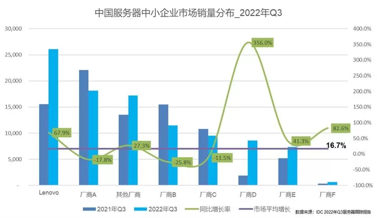 据全球知名市场调研机构IDC最新服务器市场分析数据显示,2022年第三季度,联想服务器再次荣获中国服务器中小企业市场销量榜首,市场份额达26.3%,实现连续两季度蝉联第一。本季度相较于上一季度(份额21.1%)增长超过5个百分点,同比增长率更是高达67.9%,远高于16.7%的市场平均增长率。联想服务器在中国中小企业市场的竞争优势持续扩大。