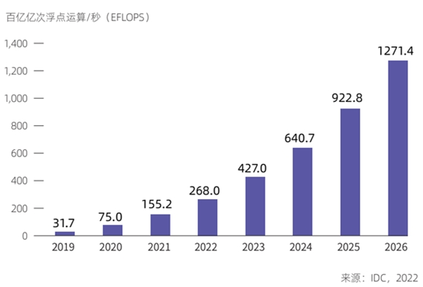 IDC预测,中国智能算力规模将持续高速增长,预计到2026年中国智能算力规模将达到1271.4EFLOPS,未来五年复合增长率达52.3%,同期通用算力规模的复合增长率为18.5%。