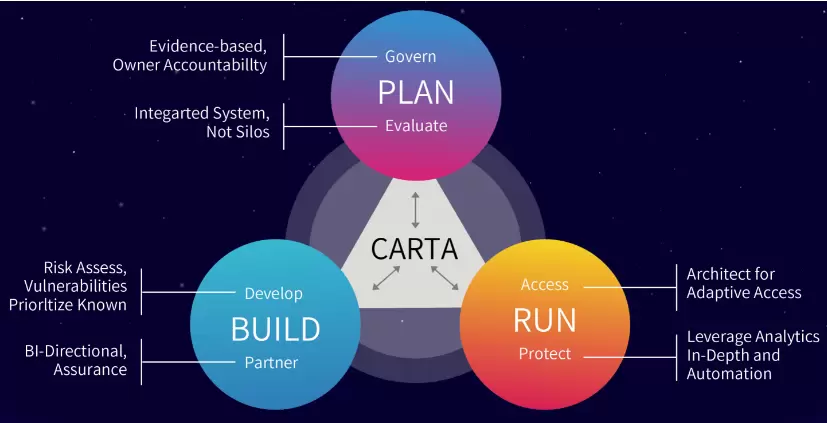 作为DevSecOps敏捷安全技术实践的最高层,也是DevSecOps敏捷安全体系建设的终极愿景,连续三年被CARTA占据。CARTA(Continuous Adaptive Risk and Trust Assessment,自适应风险与信任评估)从规划、构建、运营三个维度动态评估企业的数字化业务在整个软件全生命周期中面临的风险和信任,不追求零风险,不要求100%信任,持续构建一个信任和弹性的研运一体化安全环境,使得企业组织能够敏捷地、和业务共生地、持续进化地参与到软件供应链安全建设和保障中去。