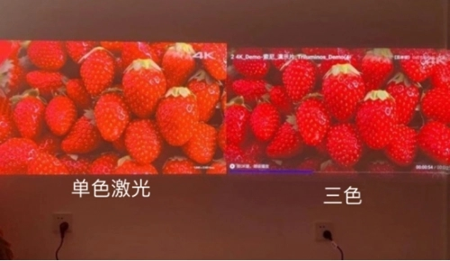 如上图所示,可明显发现搭载单色激光技术的投影显色不准确,偏暗沉,甚至将红色的草莓显示为橙色。而搭载三色激光技术的投影,其色彩已十分接近现实中肉眼所见的色彩。