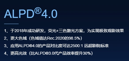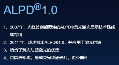 现今市面上流行的的单色激光投影指的是搭载ALPD 1.0技术的产品。ALPD 1.0技术是光峰科技公司早在2007年推出的技术。历经15年,光峰公司不断更新迭代,目前已推新至ALPD 5.0,且早在2018年间研发的ALPD 4.0中,就抛弃了单色激光,开始改用三色激光。然而国内一些无自研能力的投影厂商,却仍在使用ALPD 1.0,糊弄消费者的同时,又在全网拉踩三色激光技术,企图为ALPD 1.0这一亟待被替换掉的落后技术找补。