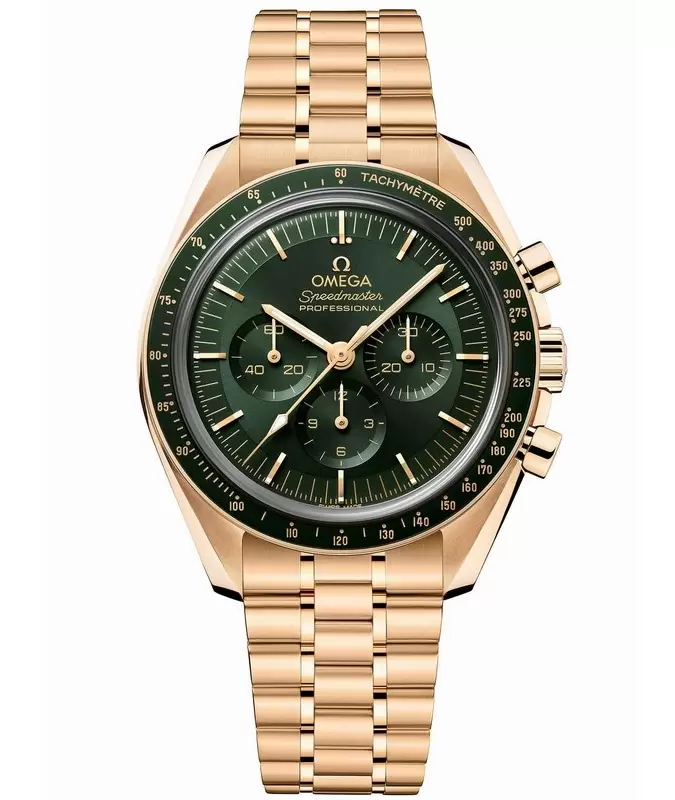 另外一款搭配绿色表盘和绿色陶瓷表圈。绿色”阶梯式”表盘经PVD处理,呈现太阳射线的打磨效果。绿色陶瓷表圈上的测速刻度采用OMEGA Ceragold技术制成,并设有早期超霸表款标志性的“Dot Over Ninety” (DON,刻度90的圆点位于数字上方) 标志。时针、分针和小表盘指针均采用Moonshine 18K金制成。