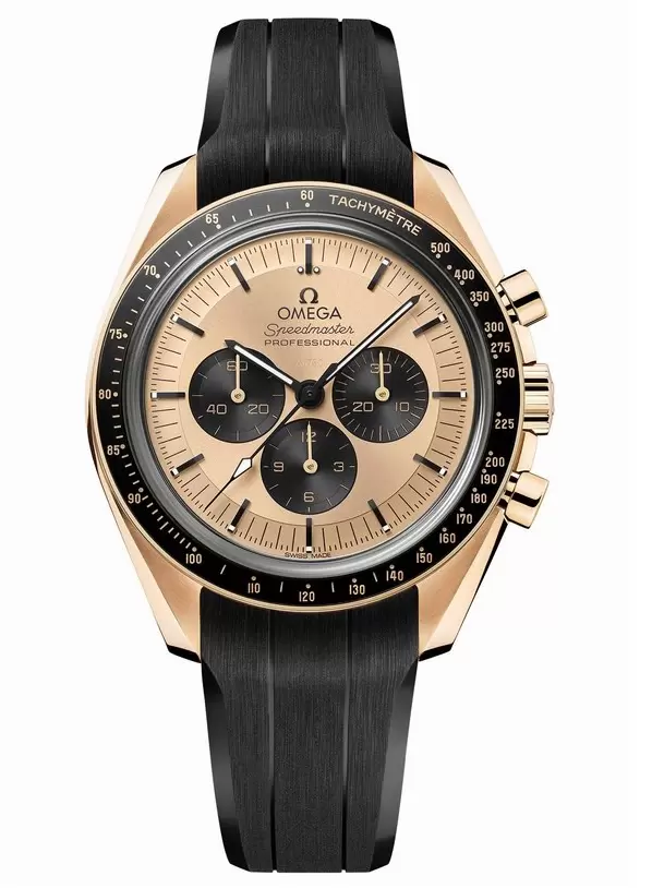 其中一款“阶梯式”表盘采用Moonshine 18K金制成,呈现太阳射线打磨效果。黑色陶瓷表圈上的测速刻度由OMEGA Ceragold 技术制成,并设有早期超霸表款的“Dot Over Ninety” (DON,刻度90的圆点位于数字上方) 标志。Moonshine 18K金小表盘覆以黑色,金质的时针和分针亦经黑色PVD处理。