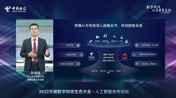 12月30日,中国电信举办2022天翼数字科技生态大会的“人工智能合作论坛”,华为昇腾计算业务总裁张迪煊受邀参加,并发表“共筑智能根基,共赢数智未来”主题演讲,共同见证中国电信在人工智能领域的布局和成果,共同拥抱改变,奔向AI。
