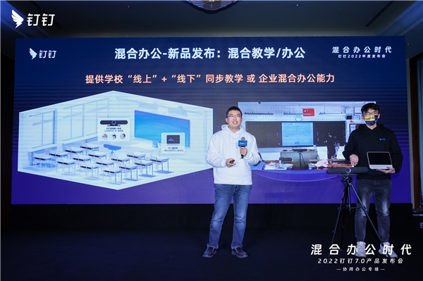 上午的主会场,钉钉总裁不穷也发布了混合教学这个新品,在此我也详细和大家介绍钉钉混合教学/办公的软硬一体解决方案。这套方案是钉钉F1会议一体机和钉小猫桌面会控终端的组合,助力学校实现“线上+线下”混合教学的能力,让在校学生和在线学生可以同时上课。老师用钉小猫可以快速拉起一个会,也可以一键让在家学生上屏互动。 钉钉F1让在家的学生也能“坐”进教室,实时拍摄黑板内容和老师的现场授课,在手机、Pad上还能和老师互动。目前,钉钉混合教学方案已经落地了浙江几家小学和中学,特别是初三和高中班级,深受欢迎。这一方案也同样适用于企业混合办公场景,提升异地会议的协同效率和参会体验。
