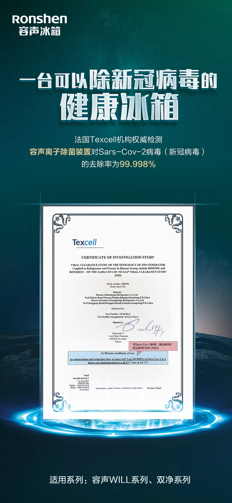 面对家中病毒活跃性、易传染性,与家中冰箱低温环境下病毒耐适性,早在2020年容声冰箱就成功研制出“AI离子除菌技术”,并于2020年12月将这一技术送检,并于2021年2月取得欧洲知名权威检测机构Texcell检测报告,认定这一技术模块对于新冠病毒Sars-Cov-2病毒的去除率高达99.998%。意味着,可以全面高效去除冰箱内可能存在的“新冠病毒”。