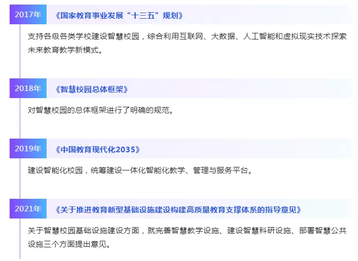 随着人工智能、大数据、物联网等技术的日渐成熟,智慧校园已然成为未来校园的发展趋势。它不仅是数字校园进一步的发展和提升,更是中国校园转型的明确方向。近些年来,国家也出台大量政策支撑中国智慧校园的建设与完善。