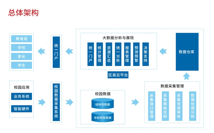 校园大数据中心围绕物联网管控中心、教学管理中心、校园服务中心、校园安全中心、信息广播中心等终端进行数据采集、汇总、分析,为学校提供可视化的教学管理分析结果。