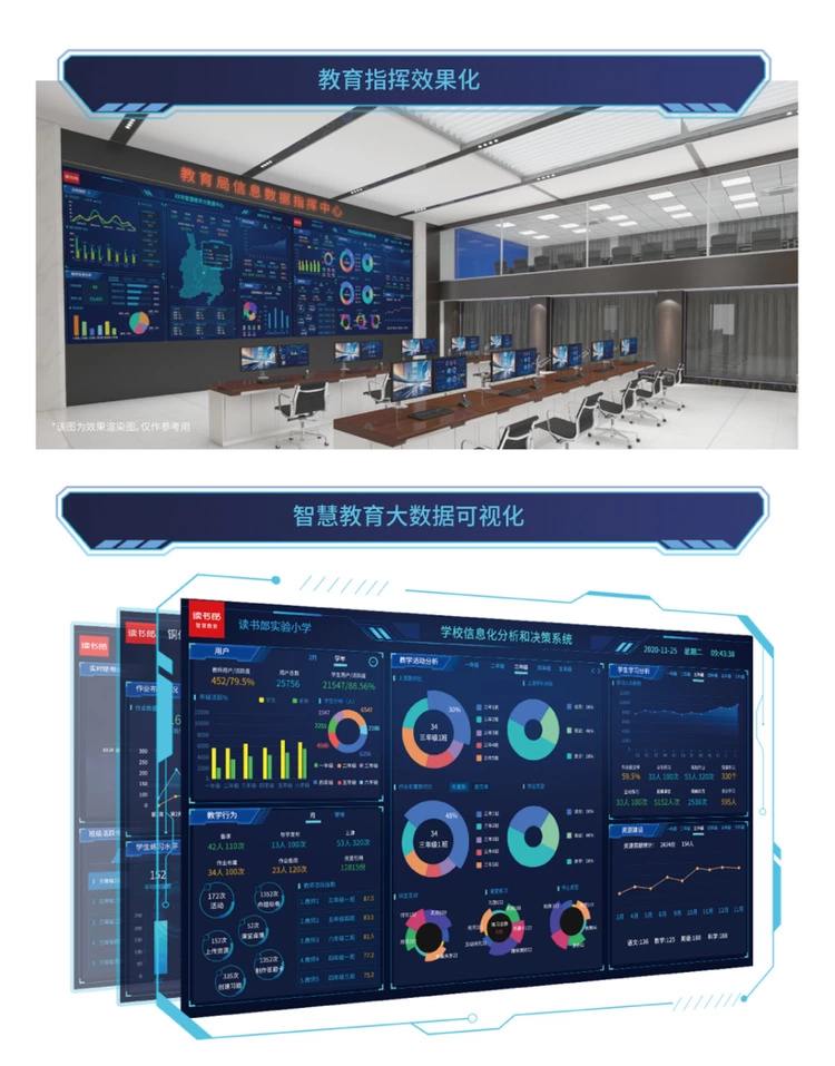 教育局信息数据指挥中心是教育局对辖区学校监管督导平台和教研平台。以辖区内各学校校园大数据中心为节点,通过可视化的教育大数据来评价各学校的发展情况,实现辖区内各学校教育与管理活动的统一管理和控制。