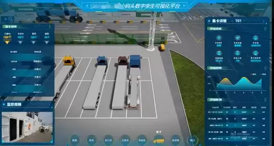 通过高精度定位设备,将港区内集卡车的定位信息、作业信息等数据及时回传至数字孪生港区平台,平台管理人员可通过孪生场景对集卡车辆进行管理,及时发现车辆作业异常信息,从港区全局维度调度作业资源,提升整体作业效率和吞吐能力。