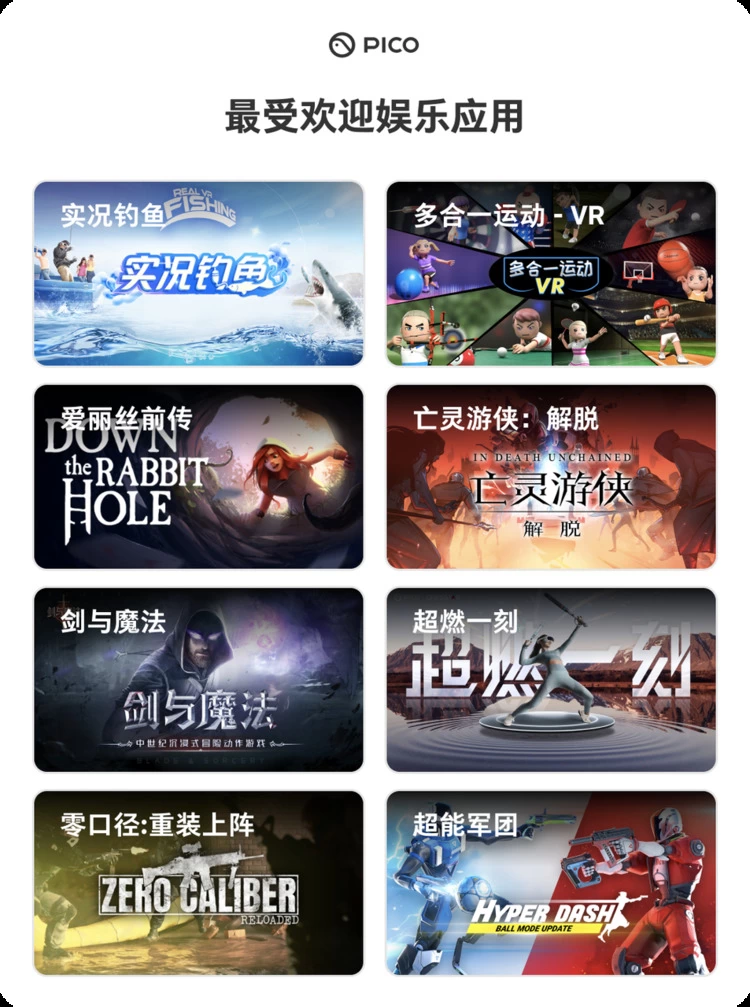 作为头部XR品牌,PICO始终致力于帮助VR开启大众化之路,而丰富且优质的内容和应用生态,是吸引大众消费者购买VR、使用VR的关键。近两年全球VR技术日渐成熟,产品快速迭代,PICO作为国内最完善的VR内容平台,亦在持续完善内容生态,积极加速与第三方的合作脚步,并在自制内容方面大力投入,致力打造国内应用最丰富、最优质的VR内容平台。迄今为止PICO应用商店已拥有超过200款国内外优质的VR应用。