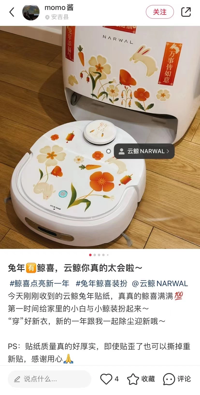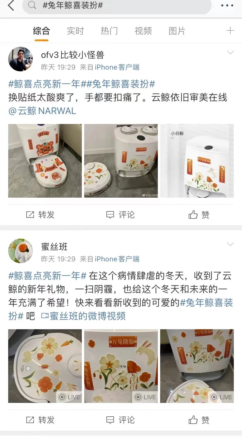 据介绍,在本次“Narwal Day”活动中,云鲸送给用户的兔年福袋包括鲸喜贴纸、鲸喜红包等等。“鲸喜红包”将新年的祝福封存和传递,而带有兔年生肖属性的专属贴纸,能让家里的“小白鲸”变身行走的拜年鲸。云鲸这一波“宠粉”的活动,也收获了很多来自用户的喜爱和好评,收到“鲸喜礼物”的新老用户纷纷化身“云鲸兔年鲸喜”的野生推广员。目前来看,在微博搜索“兔年鲸喜”装扮有4万+浏览量,而在小红书上搜索“云鲸鲸喜”有近5000笔记,用户自发参与“鲸喜点亮新的一年”、“兔年鲸喜装扮”等话题,纷纷提到“新年仪式感拉满了”、“家里小白鲸有新衣服穿了”等评价。比如小红书用户@momo酱表示,“今天刚收到的云鲸兔年贴纸,真真是鲸喜感满满”;微博用户@密丝班分享说,“在这个病情肆虐的冬天,收到了云鲸的新年礼物,一扫阴霾,这个冬天和未来的一年充满希望!”