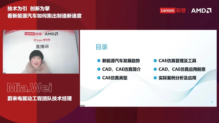 蔚来电驱动工程团队技术经理Mia.Wei和联想ThinkStation工作站高级产品经理徐洪出席本次直播活动并发表主题演讲,从用户与厂商两个角度,共同探讨在双碳目标下,新能源汽车制造领域的挑战与机遇,并结合联想ThinkStation工作站的算力优势,为新势力车企探寻能够在当下实现“弯道超车”的解题思路。