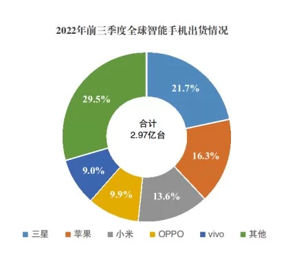 相关机构统计,2022年第三季度全球智能手机出货量为2.97亿台,同比下降9.2%,出货量前五家企业市场占有率总和为70.5%。其中,小米出货量为4050万台,市场占有率为13.6%;OPPO出货量为2940万台,市场占有率为9.9%;Vivo出货量为2670万台,市场占有率为9.0%。