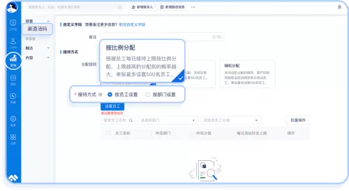 尘锋相关负责人介绍,在分享形式上,活码2.0版本在原有二维码形式的基础上,增加了小程序链接、H5链接等多种分享形式,规避了部分平台对二维码形式的限制,进一步拓展了活码的适用性,提升了投放渠道的多元化,让活码成为企业的全域获客工具。在分配规则上,活码2.0版本在随机分配、平均分配的基础上,增加了按比例分配的能力,方便管理者根据不同接待人员的实际接待能力,灵活调配接待比例,实现接待资源的优化配置。而自动锁客能力,则保证了同一客户多次扫码不会被分配给多名接待人员,从源头避免撞单事件的发生,有助于企业管理的高效性和公平性。