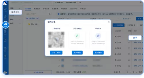 据了解,活码作为尘锋SCRM为企业提供的重要获客工具,不仅可以作为企业多平台客源入口,方便客户扫码添加对应人员,还能满足客户来源标记、渠道ROI分析等相关诉求。同时,活码还具有长期有效、灵活分配等特点。一经推出,便成为尘锋合作企业竞相使用的亮点功能。本次活码2.0版本的上线,不仅针对性强化了企业在使用过程中的自主能力,还提供5大功能升级。其中,多形式分享、按比例分配,以及自动锁客等重要能力更是受到企业伙伴的热切关注。