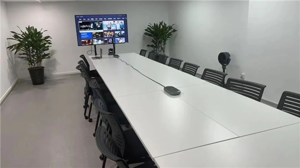 此次改造的会议室大约50平方米,会议室为狭长形,三面是实体墙,一面是玻璃墙,内置大屏电视,日常主要满足16人左右的会议需求。在领军人才答辩等一些活动中需要通过远程视频方式完成,而狭长形的会议室对收音、视频要求较高。