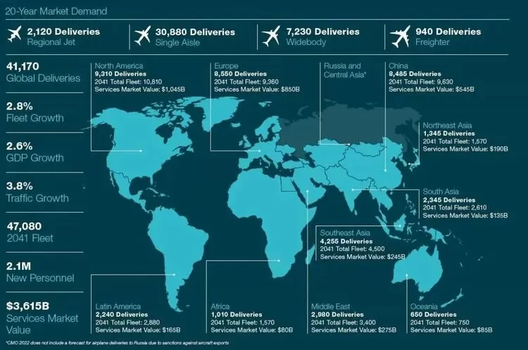 CMO预测到2022年到2041年全球飞机机队的增长率为2.8%,预计到2041年全球机队总数为47080个;