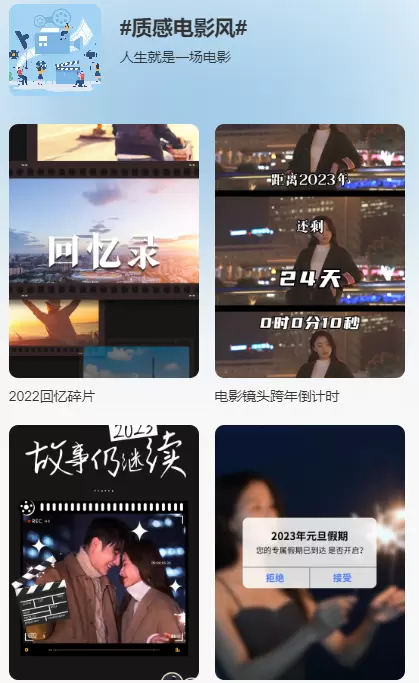本次活动中,联通电影彩铃融合优质电影内容与创新场景,特别设置了“质感电影风”彩铃DIY专区。用户可借助模板随时随地剪出电影同款大片,还能将极具电影感的“元旦假期vlog”、“春节假期碎片”、“跨年倒计时”设置为专属贺岁视频彩铃,充分利用来电间隙展示自己的“高光时刻”,让来电时刻留住精彩每一瞬!