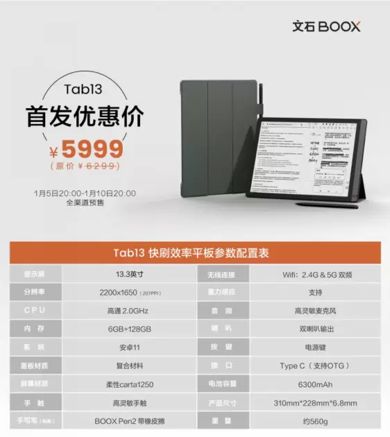 Tab13的硬件配置可谓是王者级别,13.3英寸巨大屏幕,采用的是Carta1250的柔性墨水屏,黑白对比度比Carta1000提升50%,底色更白更干净,文字显示更清晰,文字跃然纸上,质感堪比真实纸质书!搭载高通八核处理器+独立显卡芯片,6+128GB超大内存组合,配备了6300mAh超大电池。CPU、存储容量、电池容量都拉满!当然Tab13这个13.3英寸的大机器,整机重量只有560g,厚度减薄到6.8mm,毫无疑问这是工艺上的一次飞跃!4096级压感手写笔+BSR快刷技术+手写预测算法,让屏幕刷新速度较同类产品提升了50%,手写延迟维持在不易察觉的超低水平。如此高配置的Tab13,首发优惠价只需要5999元,并且在发布会当天就已经开启了全渠道预售。