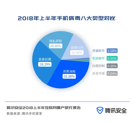 近年来,伴随移动应用的影响力逐渐超过电脑应用,主要互联网黑产也迁移到手机平台,手机病毒的数量和种类空前增长。《报告》显示,2018上半年手机病毒类型多达数十种,且大部分病毒集中在资费消耗、恶意扣费和隐私获取这三种类型,其中资费消耗类占比达到32.26%,恶意扣费和隐私获取类占比分别为28.29%和20.40%。