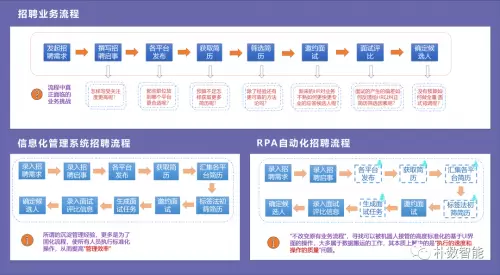 而且大多基于RPA的流程自动化方案,也是主动地宣称“不改变原有业务逻辑和流程”,其主要做法是在一个流程内寻找高度标准化的基于UI界面的固定操作, 将这一部分动作由RPA接管过来,本质上解决的是流程中操作的速度和质量的问题。