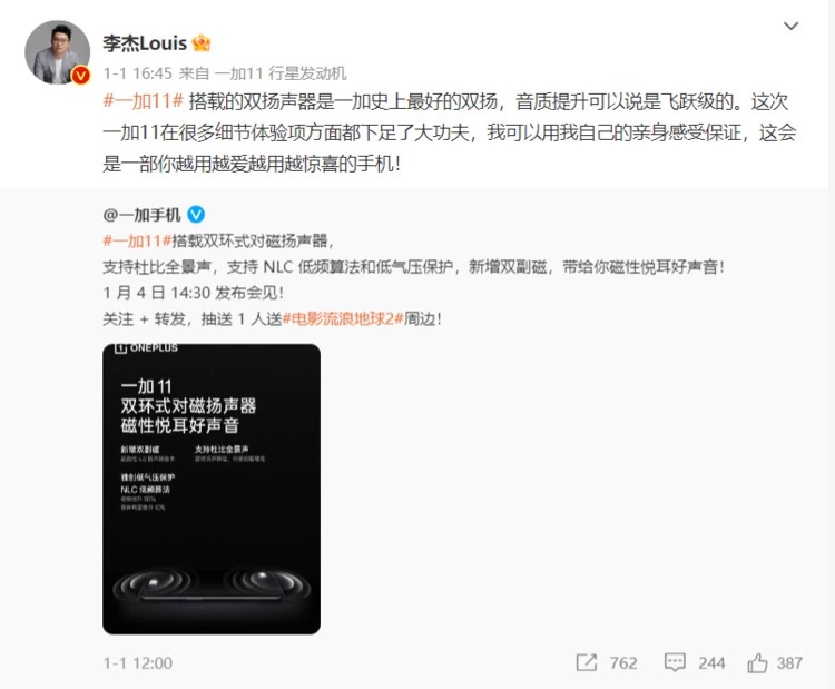 音质方面,瑞声科技为一加11量身定制了一体化声学解决方案,双扬声器BOX搭配独创NLC低频降失真算法,为用户带来高品质悦耳好声音:游戏外放时听感“声”临其境,音乐外放时音效澎湃动人,刷短视频、看直播时听觉体验也更有沉浸感。李杰表示,一加11搭载的双扬声器是一加史上最好的双扬,音质提升可以说是飞跃级的。