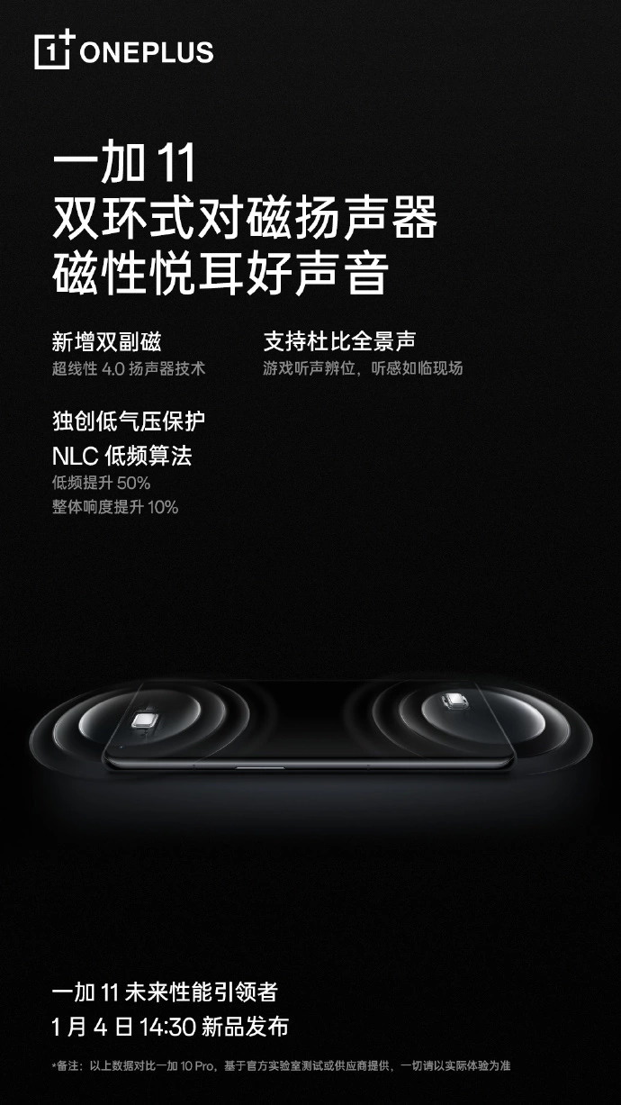 一加11的底部则搭载了行业领先的大师级SLS扬声器1116E BOX,其不仅具备更大振幅、更大声量,还降低了功耗,保证了更少失真与更动听声效。区别于传统内部磁路系统架构,大师级SLS扬声器BOX内部采用了全新的技术架构,不仅提升磁能密度,还充分提升了内部有限空间中的振动空间,降低功耗的同时,性能得到更大提升。
