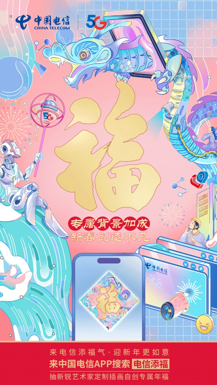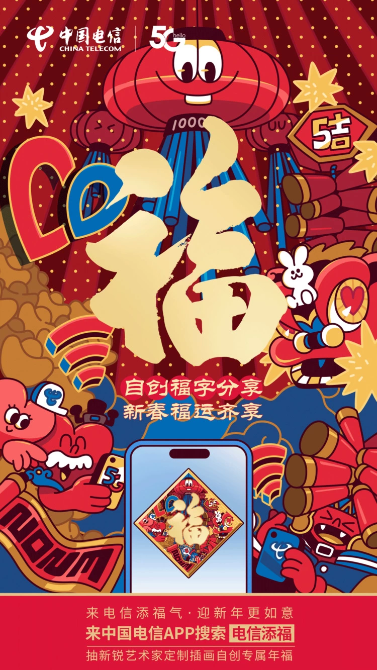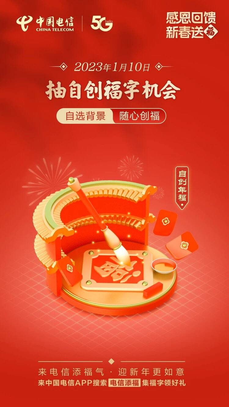 1月10日,中国电信APP上线“感恩回馈,新春送福”活动“自创年福”玩法。本次为了增加活动的趣味性及创新性,中国电信邀请5位新锐艺术大咖定制以“智享数字生活”为主题创作插画背景。用户在活动主页面抽取“自创年福” 资格后即可随心创作年福。用户自己创作的创意年福可自己保留收藏也可一键分享好友,表达自己新春诚挚的问候。