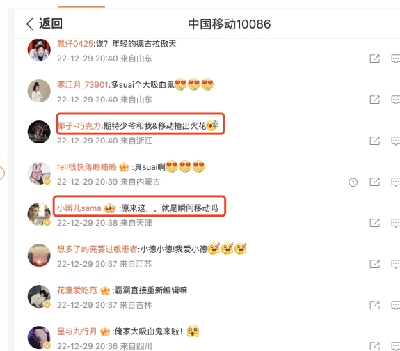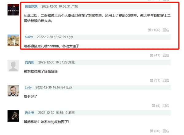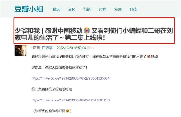 中国移动适时跟进热点,创新实现喜剧营销的方式对话年轻人,在输出品牌信息的同时提供了更为独特的情绪价值,成功撬动流量密码。让参与到这场“共嗨式”传播的粉丝成为自来水,为传统家庭市场业务的破圈增长打破更多壁垒。两支短片作为中国移动家庭业务年轻化传播的一次新尝试,让社会化营销更能满足当下年轻人对于娱乐内容的需求,通过微博平台为大家带来刘波宇宙“纯享版”后续。短片一经发布,立刻引发了粉丝们的点赞和互动在互动评区中,中国移动也赢得年轻受众的广泛好评。截至发稿前,全网播放量超600万,转发量2.1万,点赞量11.1万。鑫仔和张哲华的转发互动也扩大了话题传播性,两位演员的粉丝将中国移动植入到剧中金句,形成“不是三十秒不是十秒不是两秒,瞬间中国移动”的融梗,更是蔓延到豆瓣、抖音等多个网络平台。中国移动选择喜剧营销的方式作为与年轻人建立情感连接的基础,敢于面向年轻客户在内容营销维度上做出稀缺性和创新性,成功打造出圈营销案例,带动家宽产品口碑辐射。