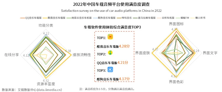 在使用车载音频过程中,界面、功能、资源等是用户较为关注的因素。通过对车载音频平台各个不同维度的对比,数据显示,酷我音乐车载版的用户使用体验综合满意度在主流车载应用平台中排名第一,其播放流畅性(4.38分)、资源丰富度(4.32分)、界面图标(4.37分)、界面色彩(4.37分)、界面皮肤(4.37分)满意度用户评价较高。随着用户视听需求的升级,用户对音频软件的关注不再局限于“听声”,同时也对音频产品细节和附加值有了更高的期待,这些都将成为车企合作时考虑的因素。