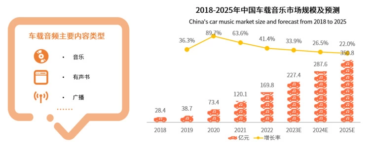 汽车需求量增大带动了车载音频的发展,音频企业在车载端的应用持续增加,用户体验得到极大的提升。以车载音乐为例,数据显示,2022年中国车载音乐市场规模达169.8亿元,预计2025年有望突破350亿元。市场需求持续放量,受到众多资本青睐。