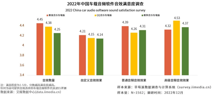 调研数据显示,在中国车载音频软件音效满意度调查中,酷我音乐车载版在音效数量、自定义音效效果、普通音频音效效果中均是最高。从四个细分维度的综合平均分看,酷我音乐车载版音效综合满意度排名第一,其次是QQ音乐车载版。