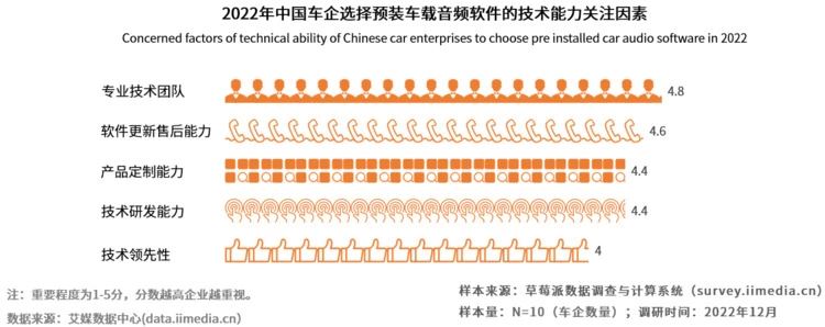 此外,车企在选择车载音频平台时,对品牌和技术较为看重。报告显示,车企在选择预装车载音频软件时,最关注的是品牌用户满意度(4.8分),其次是品牌知名度(4.6分)和市场占有率(4.4分)。品牌的用户满意度、知名度以及市场占有率代表着该品牌在市场上所受到的认可,车企在选择合作时更倾向于选择有广泛用户基础的品牌;在车载音频软件技术能力方面,数据显示,车载音频企业是否拥有专业的技术团队是车企关注的重点(4.8分)。如何拓展新的音娱体验场景、最大化释放音娱内容的价值,成为各大音频平台车载场景的突破口。