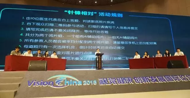 本次活动不同于以往单纯的人机pk活动,采用了人机协作的PK方式。一方是赵明威教授领衔的5位医生专家团队,另外一方是陈峰教授领衔的5位非眼底专业的年轻医生+AI团队。同时,台下的数百医生也被随机分配到专家队和AI队,瞿佳、唐仕波、刘江、刘铁瑛、金熙作为活动评委。