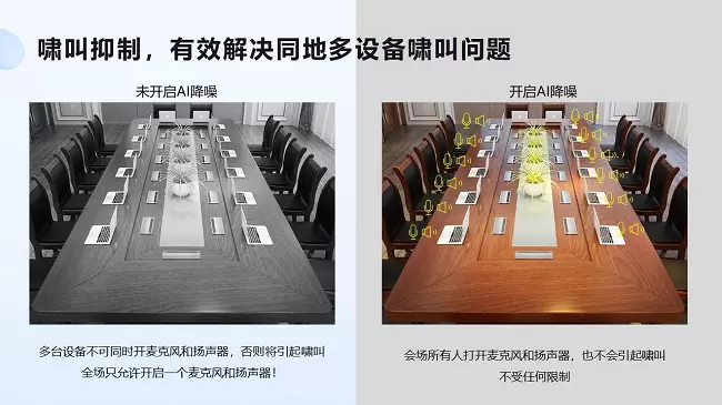 以啸叫抑制为例,声网 AI 降噪可有效的解决同地多设备啸叫的问题。如下图所示,在视频会议场景中,当没有开启 AI 降噪时,同时打开多台麦克风和扬声器便会引起啸叫,这会极大影响参会者的参会体验。开启声网 AI 降噪后,全场所有人均可以打开麦克风和扬声器,而不会出现啸叫的情况。