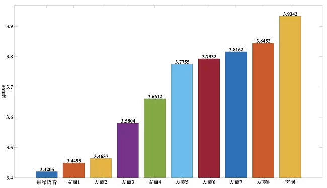GMOS 是一个相对综合的主观指标,主要考量的是降噪性能和语音保护的综合指标,声网 AI 降噪在和 8 个友商的对比中取得了最高分3.9342分,也是唯一超过3.9分的。
