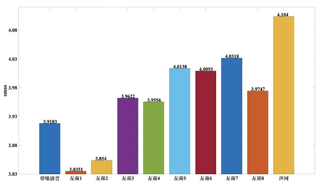 SMOS 侧重的是降噪时对语音的保护是否够好,声网 AI 降噪在和 8 个友商的对比中取得了最高分4.104分。