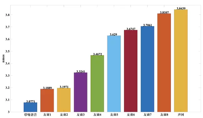 NMOS 主要衡量的是对于噪声的抑制程度,也就是噪声残留的多少,声网 AI 降噪在和 8 个友商的对比中同样取得了最高分3.8439,但同时友商8的得分也达到了3.8107分,与声网较为接近。