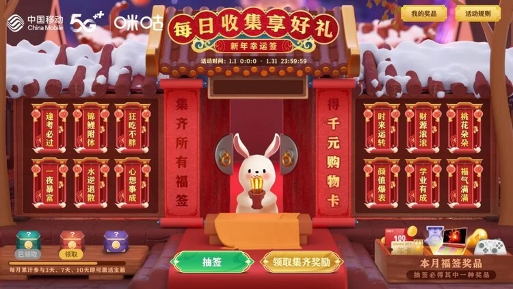 随着移动互联网技术不断进化,通过手机等移动设备随时随地玩游戏早已成为大众娱乐的方式之一。作为国内领先的5G云游戏平台,咪咕快游APP不仅拥有MOBA、第一人称射击、RPG、塔防、棋牌以及赛车等多类型热门IP大作,还在春节期间每日推出不同主题的专题活动,与玩家们一起开启快乐兔年。